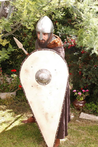 Souliers + bandes molletières (ou bottes), gambison, + tunique, pantalon, cotte de maille, camail (cagoule de maille), cal gambisonné, casque, ceinture, , canons d'avant-bras en cuir, gants, ARME PRINCIPALE : Epée ou Lance, et bouclier.